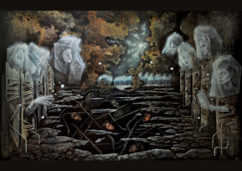 «Aquelarre», ejecutada en 2014 como una monumental pieza de técnica mixta sobre madera (150 x 200 cm en su formato original), es una de sus composiciones más imponentes. La obra nos sitúa frente a una fosa tectónica donde un laberinto de tuberías atrapa rostros durmientes o ahogados en aguas oscuras. Flanqueando este abismo, figuras femeninas espectrales, coronadas por enigmáticos velos geométricos, presiden el silencio de la escena, iluminadas apenas por orbes flotantes y el resplandor de un bosque distante. Es una reinterpretación moderna y profundamente inquietante de la reunión de brujas.