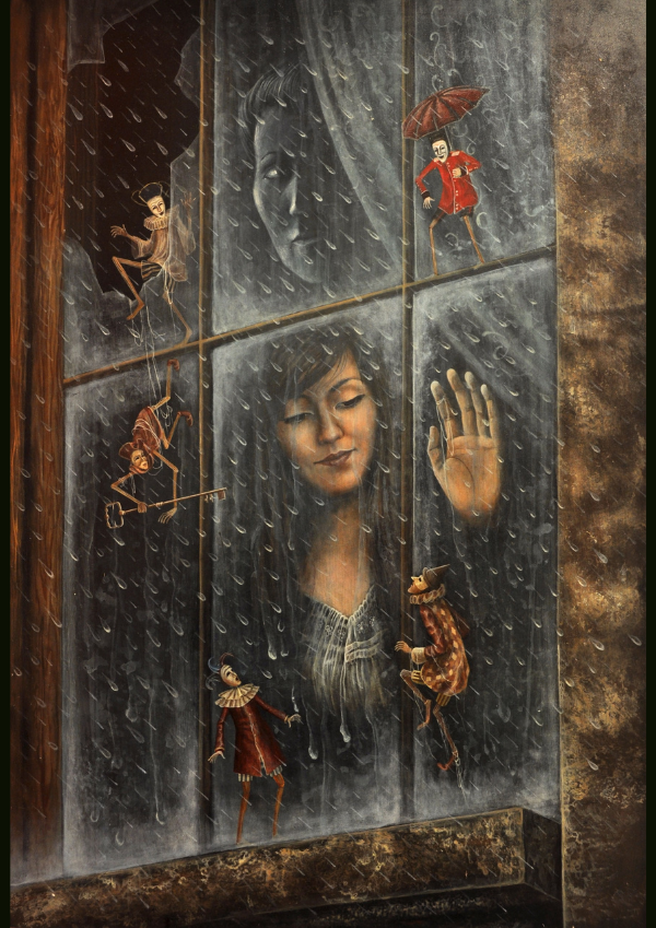 En «Concilio Interno», una imponente pintura acrílica sobre madera (originalmente de 80 x 100 cm), asistimos a un momento de profunda introspección. Una mujer apoya su mano contra el cristal empañado por la lluvia, con la mirada perdida en la melancolía. Sin embargo, no está sola: el marco de la ventana es invadido por arlequines y figuras de circo en miniatura —uno de ellos sosteniendo una llave— que trepan y deambulan por el vidrio. En el cristal superior, un rostro fantasmal observa en silencio. Esta composición es una brillante metáfora del «concilio» de voces, recuerdos y emociones que habitan en nuestro subconsciente, debatiendo mientras el mundo exterior sigue su curso bajo la tormenta.