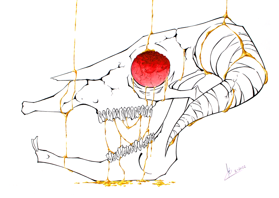 Cráneo de vaca con rosa y oro
