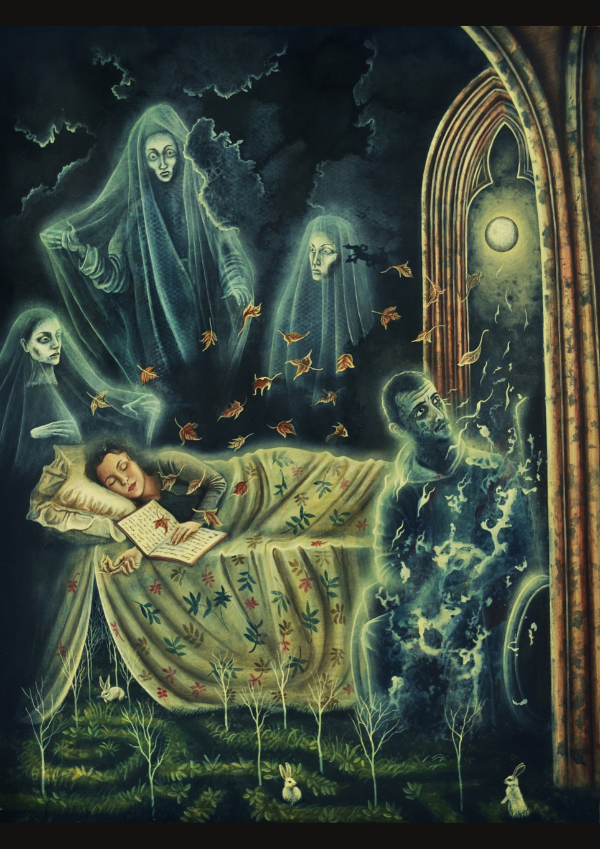 En «La Isla de las Ausencias», una conmovedora pintura acrílica sobre madera ejecutada en 2014, el artista nos sumerge en el misterioso territorio de los sueños. Una joven duerme plácidamente con un libro abierto sobre su lecho, el cual parece echar raíces y fusionarse con un bosque nocturno por el que corretean pequeños conejos. La escena respira melancolía: tres figuras femeninas veladas flotan como guardianas del letargo, mientras una ráfaga de hojas secas envuelve a un hombre espectral que se desvanece —o quizá se materializa— frente a un arco gótico bajo la luz de la luna. Es una alegoría magistral sobre la pérdida, la evocación de los que ya no están y el amor que trasciende el plano físico.